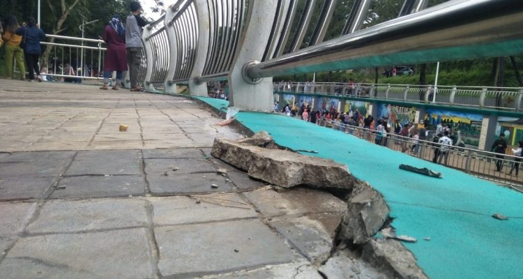 Pantauan awak media di lokasi, ada retakan pada coran salah satu pagar tembok penahan tanah/tebing (TPT) taman tersebut. Retak-retak cukup panjang juga ditemukan pada ubin lantai di sejumlah titik taman.
