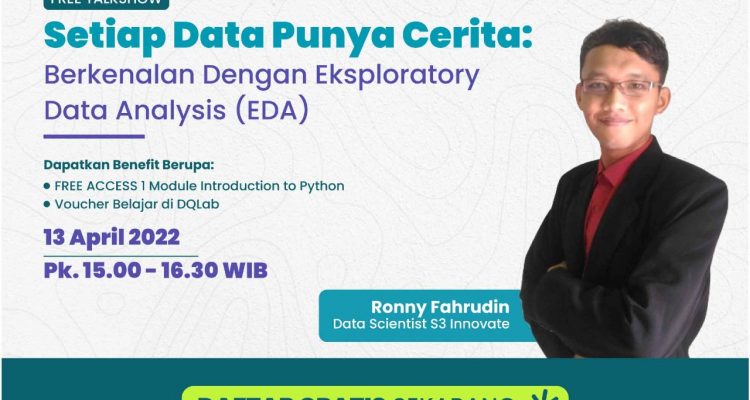 DQLab siap menjawab kebutuhan Sahabat DQ! Yuk, kupas tuntas pembahasan EDA pada Free Talkshow yang akan diselenggarakan oleh DQLab dengan judul “Setiap Data Punya Cerita: Berkenalan Dengan Eksploratory Data Analysis (EDA)” bersama speaker praktisi data professional Ronny Fahrudin – Data Scientist S3 Innovate.