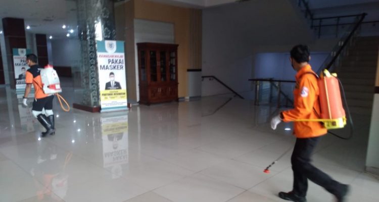 Terpantau pada Rabu (6/1) terlihat puluhan petugas dari BPBD Kota Tangsel melakukan penyemprotan desinfektan ke seluruh ruangan di DPRD.