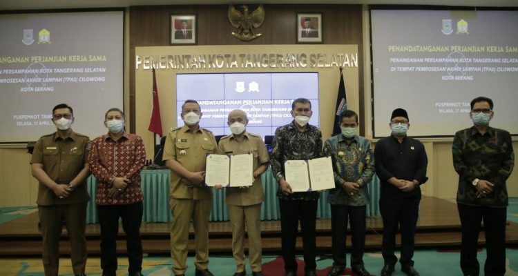 BESTTANGSEL.COM, CIPUTAT – Pemerintah Kota Tangerang Selatan akhirnya melakukan penandantangan perjanjian kerjasama dengan Pemerintah Kota Serang terkait dengan Pemanfaatan Tempat Pembuangan Akhir (TPA) Cilowong, Kota Serang. Penandatanganan tersebut dilakukan di Pusat Pemerintahan Kota Tangerang Selatan, Ciputat. Selasa (27/4) bertempat di Aula Blandongan.