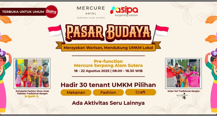 BESTTANGSEL.COM, Tangerang– Dalam rangka menyemarakkan Hari Kemerdekaan Republik Indonesia ke-80, Mercure Serpong Alam Sutera mengajak masyarakat untuk turut serta merayakan kekayaan budaya Indonesia dan semangat kebersamaan melalui rangkaian acara spesial dalam Pasar Budaya. Acara ini akan berlangsung pada 18–22 Agustus 2025, mulai pukul 08.00 – 18.30 WIB di Prefunction Area, Mercure Serpong Alam Sutera.