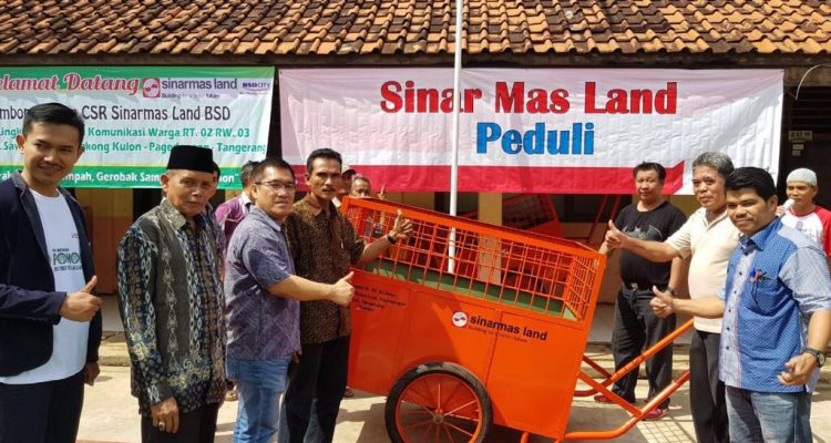 Sinar Mas Land menyerahkan bantuan berupa tempat sampah organik dan anorganik sebanyak 248 buah, saringan komposter 3 buah, gerobak sampah 3 buah, dan bibit pohon buah sebanyak 50 batang, kepada masyarakat Desa Lengkong Kulon Pagedangan, Tangerang.