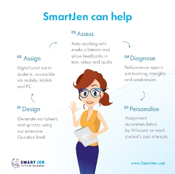 Secara tradisional, pendidik harus membeli buku penilaian hard copy, memotong, menempel scan dan mencetak lembar kerja. Kerumitan multistage ini sangat kontras dengan kenyataan saat ini. Dalam satu platform tunggal, seseorang dapat merancang, menetapkan, menilai, mendiagnosis, dan mempersonalisasikan rencana pengajaran. Dengan proses 5 langkah ini, SmartJen telah merampingkan dan memusatkan pekerjaan pengajaran dan transfer pengetahuan.