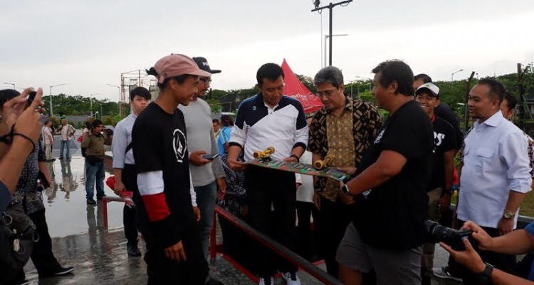 Didampingi Managing Director President Office Sinar Mas Land Dhony Rahajoe, dan Charlie, pelatih tim nasional Skateboard Indonesia, Menpora tampak bersemangat. Sambil sesekali bertepuk tangan, Menpora terus memberi dukungan.