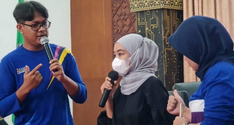 Fasilitator XL Axiata Future Leaders, Robi Kurnia (paling kiri kaos biru) saat memberikan pembekalan kepada salah seorang wisudawan Universitas Andalas Padang.