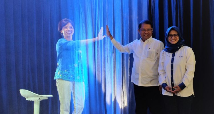 Direktur Teknologi XL Axiata, Yessie D. Yosetya ( kiri, dalam bentuk hologram ) menyapa Menteri Komunikasi dan Informatika RI, Rudiantara dan Presiden Direktur & CEO XL Axiata, Dian Siswarini dalam acara Uji Coba Layanan 5G XL Axiata dan Fiberisasi Jaringan di Jakarta, Rabu (21/08).