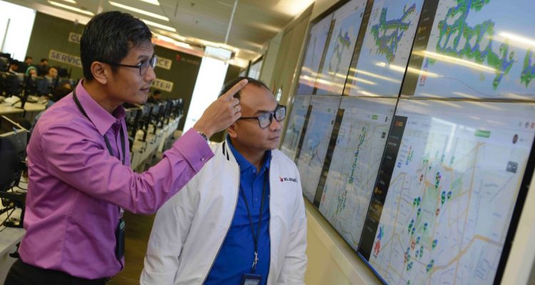 Plt. Chief Teknologi Officer XL Axiata, I Gede Darmayusa (kanan) bersama dengan Head Telco Service Operation XL Axiata, Hendrik (kiri) menunjukkan kondisi jaringan XL Axiata di seluruh Indonesia melalui papan monitor yang berada di pusat pemantauan kualitas jaringan layanan XL Axiata atau “Customer Experience and Service Operation Center (CE&SOC) yang berada di kantor pusat XL Axiata Jakarta, Selasa(10/12)