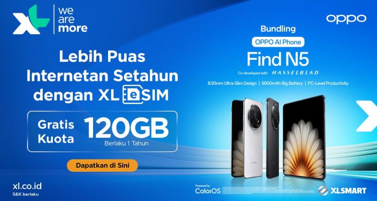 Bekerja sama dengan OPPO Find N5, XLSMART menawarkan total kuota hingga 120GB yang dibagikan secara bulanan selama 12 bulan, dengan rincian 2GB kuota utama dan 8GB bonus kuota YouTube yang langsung aktif sejak aktivasi. Pelanggan juga akan mendapatkan eSIM XLSMART secara gratis tanpa biaya tambahan. Penawaran ini berlaku mulai 1 Mei 2025 dan menjadi salah satu bentuk kolaborasi strategis XL Axiata dalam mendukung ekosistem digital berbasis eSIM.